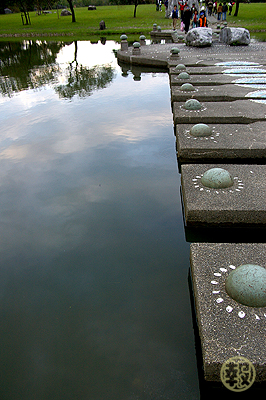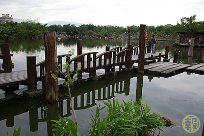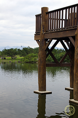 展望廣場下方遙望對岸圓形廣場。湖光水色,好不美麗。濕生植物區的木棧橋。
