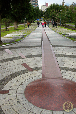 剖半的白色石塊,往前對應還有另一塊,一直綿延下去。馬賽克圓形地飾,往前一直通到圓形廣場。