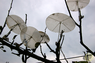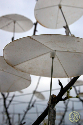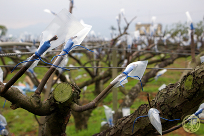 剛開始的時候還有農民為了節省成本,用保麗龍碗加竹筷子幫梨花撐傘,結果一陣風就全部吹掉,現在用夾子夾而且可重複使用的塑膠傘。