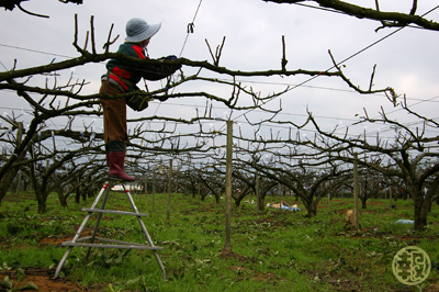 在梨樹開始結果之後還要經過一次挑選,把不好的梨子在還沒長大之前就剪掉,只留下最漂亮完美的梨子套上多層的牛皮紙套,梨子的生長過程完全在套子裡度過,不會與外界有所接觸,所以如果你能買到整袋剛剪下來的梨子,放心大口咬下去,絕對不會有汙染的。