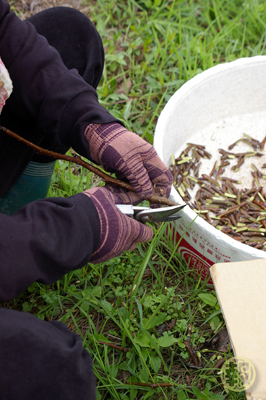首先將枝條留下適合嫁接的長度,現在都用電剪,省力多了,這位大哥強調,他戴的不是太陽眼鏡,為眼睛怕強光,是會變色的近視鏡片,其實如果是穿Levi's 501來工作,報報也不會覺得奇怪啦^^